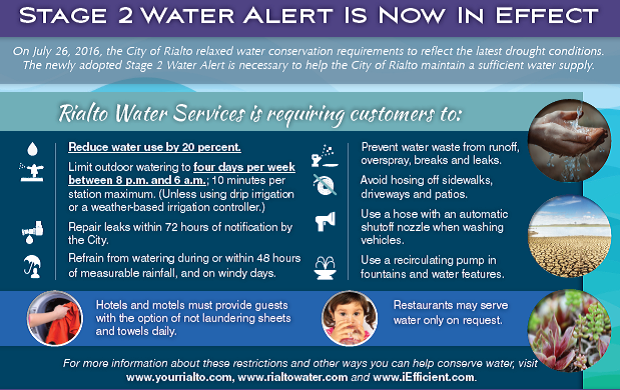 On July 26, 2016, the City of Rialto relaxed water conservation requirements to reflect the latest drought conditions. The newly adopted Stage 2 Water Alert is necessary to help the City of Rialto maintain a sufficient water supply.
